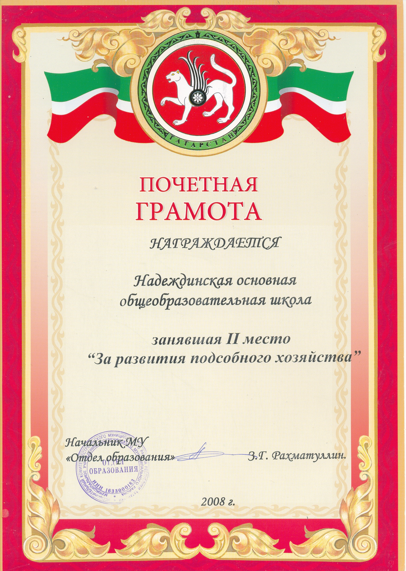 II место "за развитие подсобного хозяйства" август 2008 г.